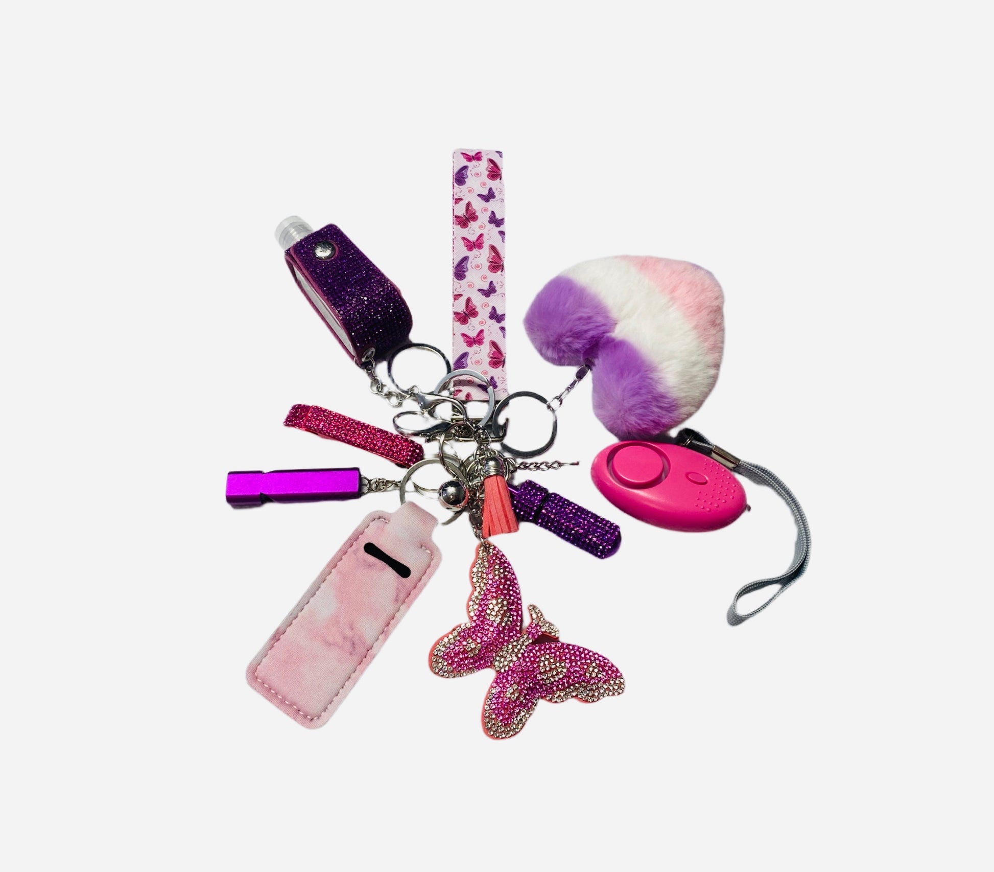 Includes: Butterfly Wristlet, Lipstick Holder, Security Alarm, Heart Pompom, Whistle, Seat Belt Cutter, Bling Bottle Opener, Hand Sanitizer, and Bling Pill Holder, and our NEW Bling Butterfly Charm!