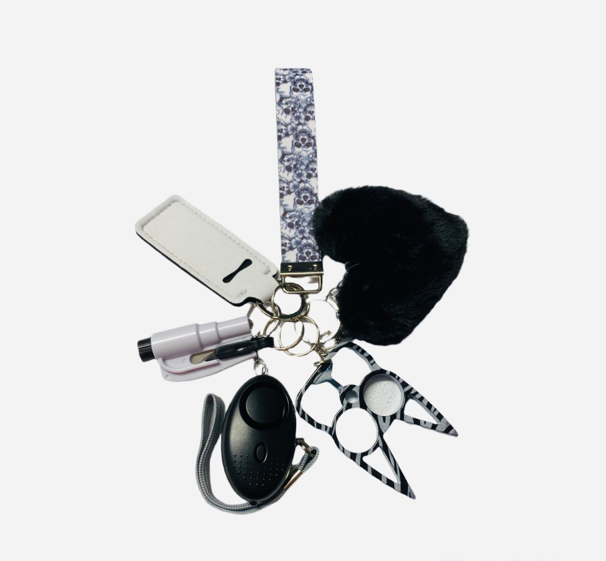 Includes: Wristlet, Lipstick Holder, Security Alarm, Seatbelt Cutter, Heart Pompom and Kitty Knuckles. (VERY LINITED STOCK- WHILE SUPPLIES LAST)