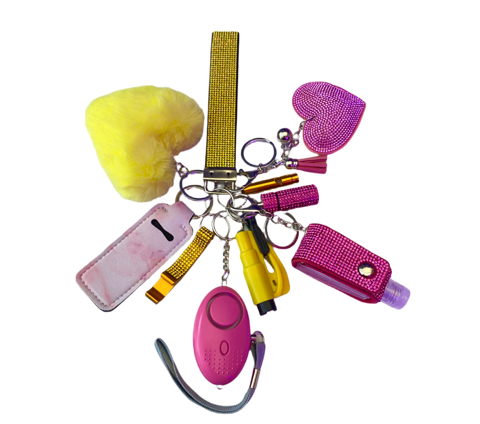 Includes: Bling Wristlet, Bling Heart Charm ,Lipstick Holder, Security Alarm, Heart Pompom, Whistle, Seat Belt Cutter, Bottle Opener, and Bling Pill Holde,r, Hand Sanitizer.