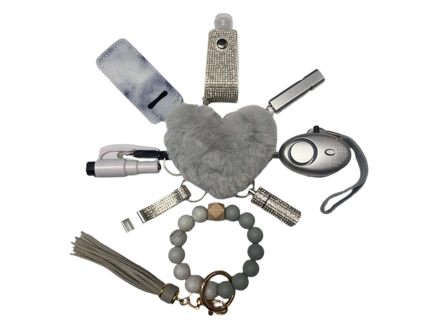 Includes: Silicone Beads, Bling Hand Sanitizer, Lipstick Holder, Security Alarm, Heart Pompom Ball, Whistle, Seat Belt Cutter, Bottle Opener, and Bling Pill Holder.