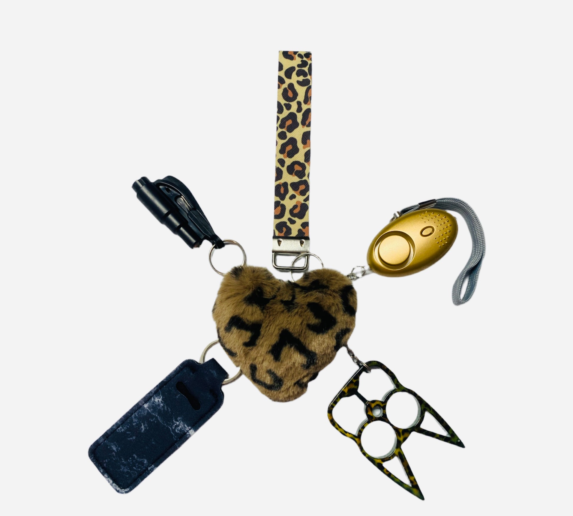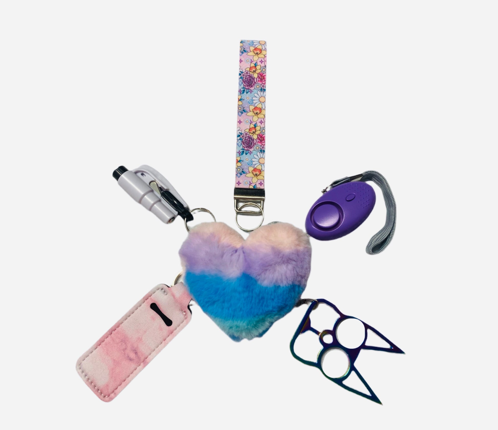 Includes: Wristlet, Lipstick Holder, Security Alarm, Seatbelt Cutter, Heart Pompom and Kitty Knuckles. (LV KEYCHAIN SETS ARE $32- VERY LINITED STOCK- WHILE SUPPLIES LAST)