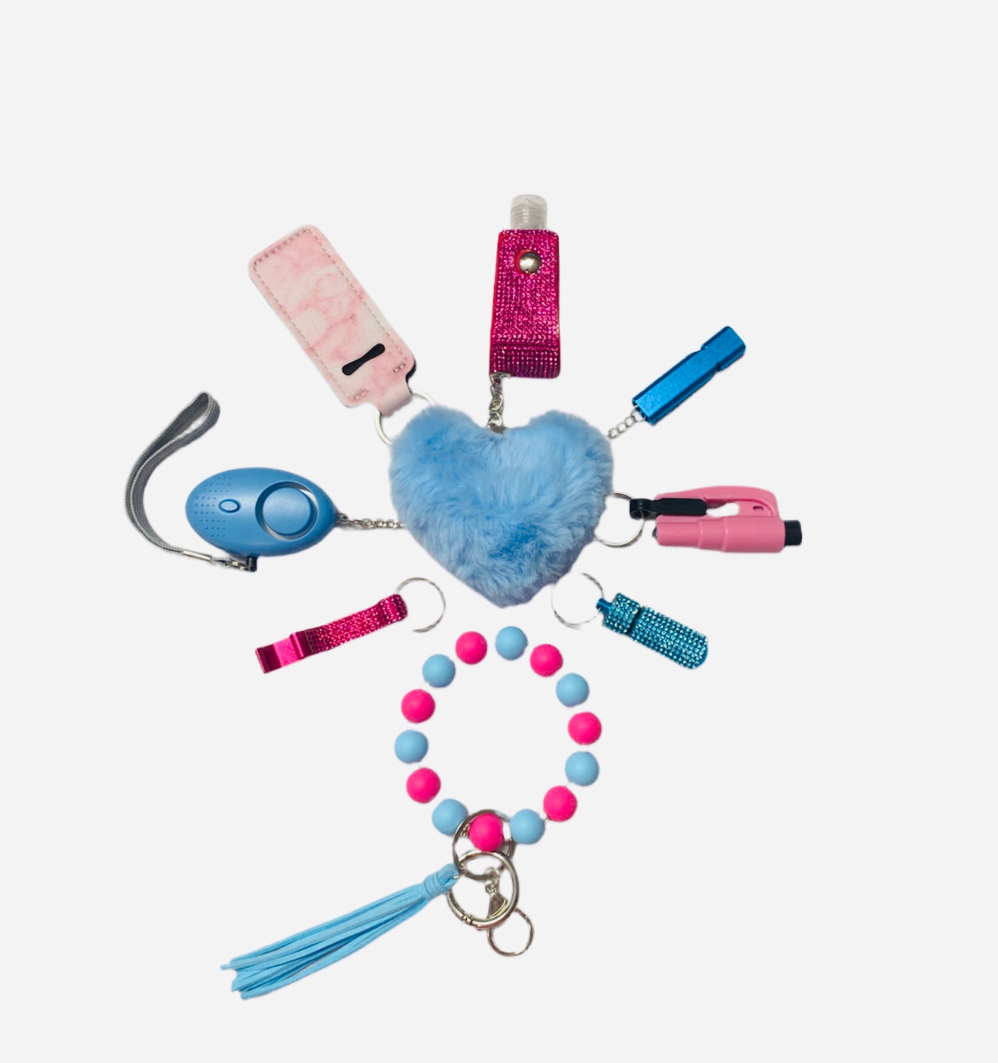 Includes: Silicone Bead with Rhinestones, Bling Hand Sanitizer, Lipstick Holder, Security Alarm, Heart Pompom Ball, Whistle, Seat Belt Cutter, Bottle Opener, and Bling Pill Holder.